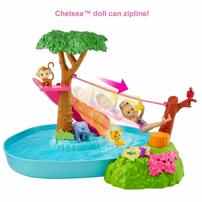 This Barbie and Chelsea The Lost Birthday Splashtastic Pool Surprise playset takes 3 to 7 year olds on a jungle river adventure packed with fun and animal friends! Chelsea™ doll is ready for a fun day on the water with her baby monkey, elephant and tiger friends — there’s even a parrot that can perch on the tree. Kids can fill the playset with water so Chelsea™ doll and her animal pals can swim, slide and float around the island. There are lots of adventures to be had — help them climb the tree to slide down into the river or zipline to the other side! Chelsea™ doll bends at the hips to sit comfortably in her floatie as she floats around the river, and a beverage and towel accessory let kids play out their stories with realistic detail.