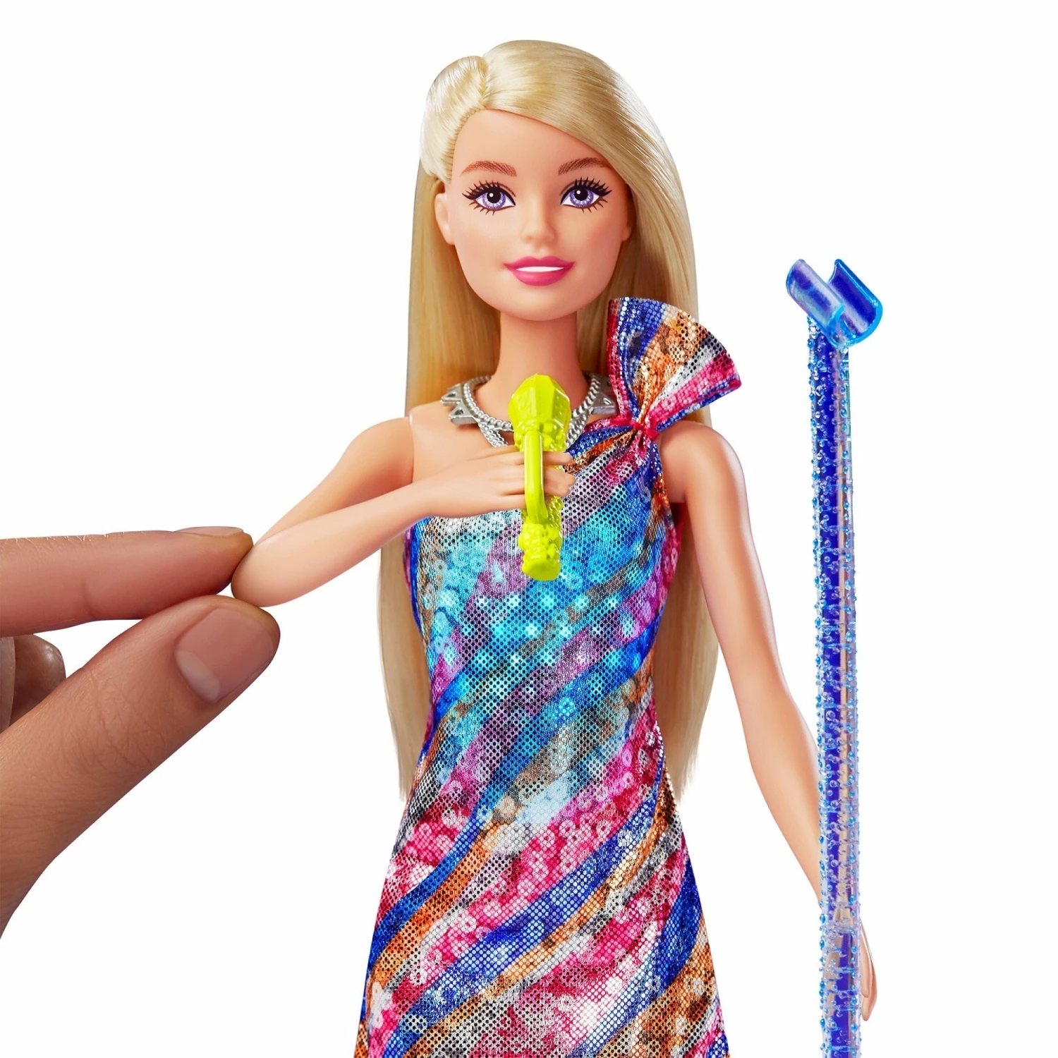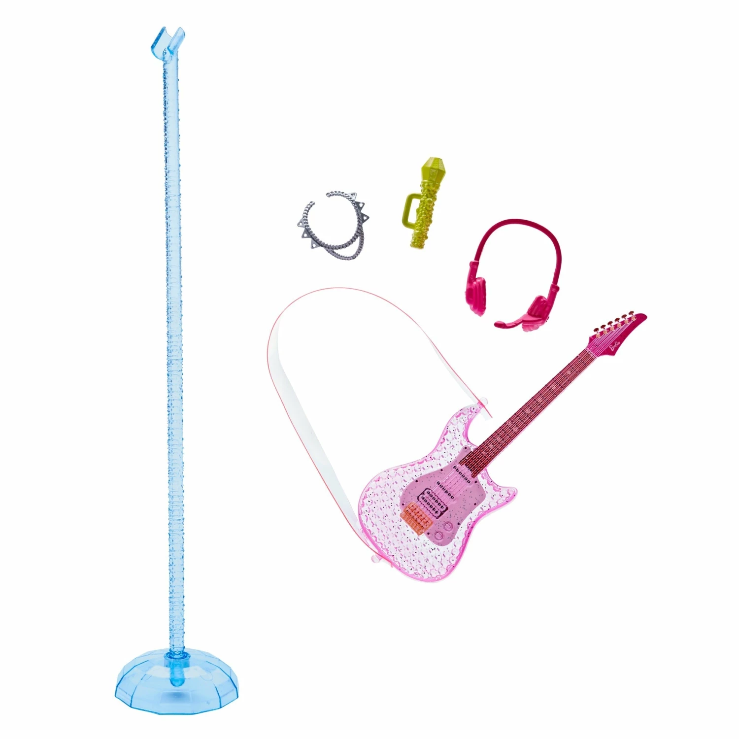 Imaginations can relive an epic onstage moment with Barbie “Malibu” Roberts doll in her signature performance look from Barbie: Big City, Big Dreams ! Ready for the spotlight? When kids lift Barbie doll’s microphone to her mouth, music will play, her dress will light up, and she’ll sing along to one of two original songs! When her arm is rested back in place, the music will keep playing but Barbie doll will stop singing until kids lift the microphone up again. Kids ages 3 years old and up can add Barbie “Brooklyn” Roberts doll to their collection to complete the rockin’ duet and imagine their own big adventures! Doll cannot stand alone. Colours and decorations may vary. Key Features: Relive an incredible onstage moment with Barbie “Malibu” Roberts doll inspired by Barbie: Big City, Big Dreams ! When kids lift Barbie doll’s microphone to her mouth, music will play, her dress will light up, and she’ll sing along to one of two original songs! When her arm is rested back in place, the music will keep playing but Barbie doll will stop singing until kids lift the microphone up again. Inspired by her signature performance look, Barbie doll wears a shimmery dress, necklace and shoes. Help her rock out with accessories including a guitar, headset, a microphone with a stand and more! Ready to take the stage, this Barbie: Big City, Big Dreams doll makes a great gift for 3 to 7 year olds, especially those that love singing and musical fun!