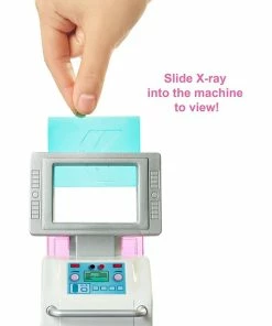 The clinic includes a brunette Barbie® doctor doll (12-in/30.40-cm) and 4 play areas: a medical station, exam table, X-ray machine and gift shop. Kids can make casts for their doll “patient” (sold separately) with a realistic cast making feature (use pink, purple or white dough) to create casts for the patient’s arms and legs and create wraps with the bandage maker.