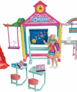Chelsea and her friends inspire young minds to explore the world. Just like big sister Barbie, they love to try new things, challenge themselves and have fun. This Barbie Club Chelsea School playset is the perfect place for young minds to explore the classroom and beyond! Sweet schoolhouse decorations, storytelling accessories and multiple play areas inspire imaginative fun. When class is in session, seat Chelsea doll and a friend (sold separately) in the two desk and chair sets. A blackboard accessory encourages storytelling: flip it back and forth to switch between subjects. When it’s time for recess, send Chelsea doll down the slide or clip her into the swing and push! Don’t forget to stop by the cafeteria for a snack — a lunch counter, trays and a cash register add to the storytelling fun. Young imaginations will love exploring the school setting and playing out their own sweet stories because when a girl plays with Barbie and her sisters, she imagines everything she can become! Collect all the Chelsea dolls and toys to expand the playtime possibilities (each sold separately, subject to availability). Colours and decorations may vary. Features: Barbie Club Chelsea dolls and toys inspire imaginations to explore the world with fun themes kids love – like this Chelsea school playset with multiple play areas and pieces that can be arranged and rearranged for storytelling fun! A classroom area inspires storytelling with desk and chair sets for Chelsea and a friend (sold separately) and a flipping blackboard with fun graphics. A cafeteria space features a lunch counter with a cash register and lunch trays, so Chelsea doll can grab a snack before recess. When it’s time to play, send her down the slide or clip her into the swing and push! With so many themed play pieces, like notebooks, juice boxes, school supplies, a backpack and pair of glasses for Chelsea, imaginations can play out endless school stories. Chelseaâ„¢ doll is ready for class in a top with a sun graphic, a removeable skirt with bright rainbow print and casual white shoes. With so many storytelling pieces and multiple play areas, this Chelsea doll and school playset makes a great gift for kids 3 to 7 years old. Collect all of the Chelsea dolls and accessories for even more storytelling fun (each sold separately, subject to availability). Barbie Club Chelsea Doll and School Playset, 6-inch Blonde, with Accessories Includes Chelseaâ„¢ doll wearing skirt and shoes, school playset, 1 pair of glasses, 1 pair of scissors, 1 glue bottle, 1 cash register, 2 juice box accessories, 2 notebooks, 2 lunch trays, 1 slide, 2 desks, 1 blackboard accessory and 1 backpack. Other doll is not included. 3+