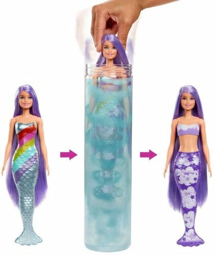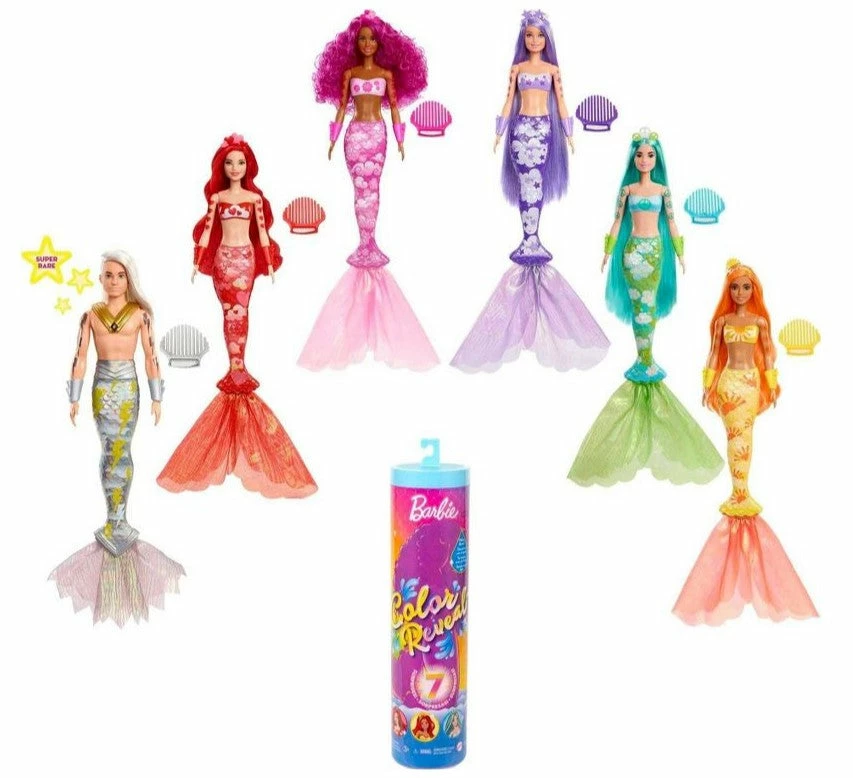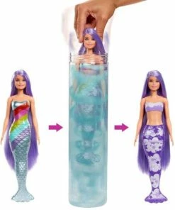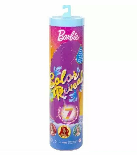 Barbie Color Reveal dolls deliver an unboxing experience full of surprises -seven of them! A doll with a colorful mermaid tail is guaranteed, but each doll’s look remains a mystery until revealed. The packaging is part of the fun -pull the strip to remove the outer layer and reveal a clear tube. Inside are a Color Reveal mermaid doll, whose full look is hidden behind the metallic blue rainbow-print coating, and four bags with surprises.