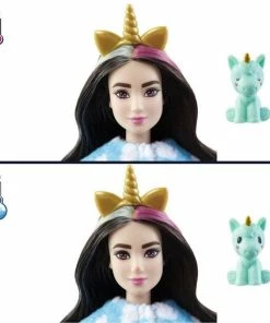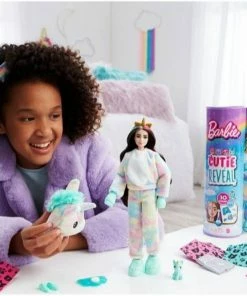 Barbie Cutie Reveal Fantasy Series dolls offer the cutest unboxing experience with 10 surprises, including a posable Barbie doll! Unbox the package to find a soft, plush unicorn friend and four surprise bags. Remove the rainbow unicorn costume to find a Barbie doll with long hair and twinkle-shine details. Open the surprise bags to find shimmery clothes, accessories, a sponge-comb and a mini pet unicorn.