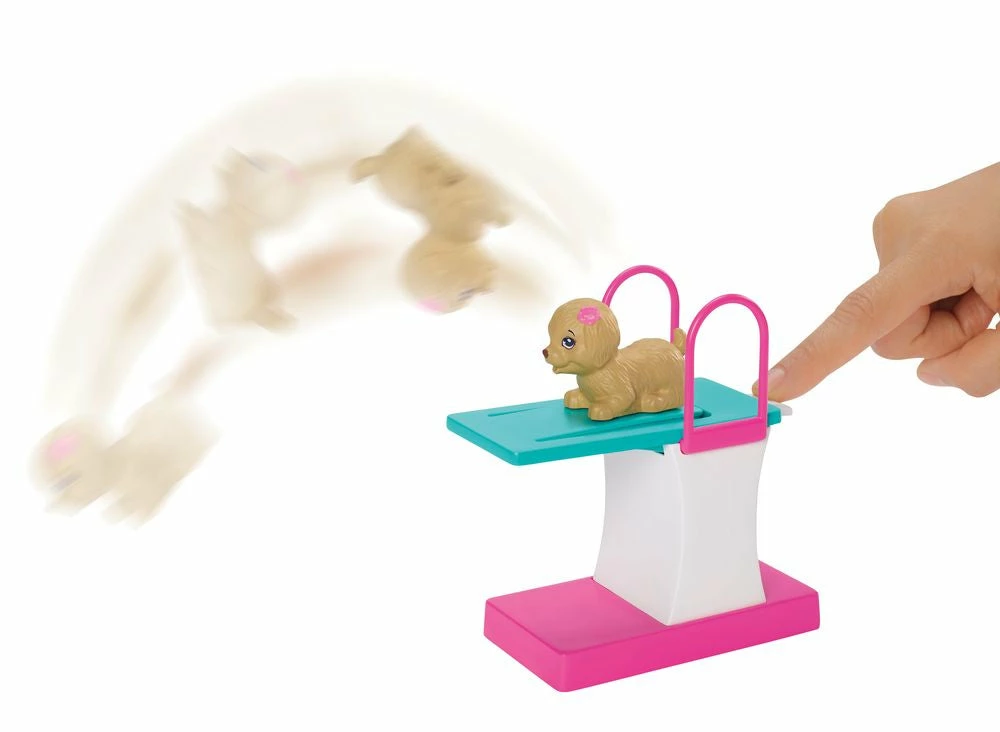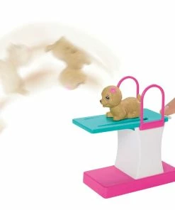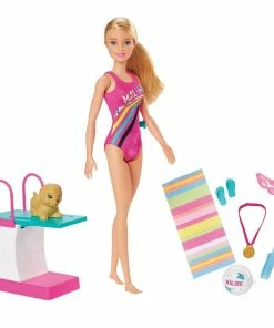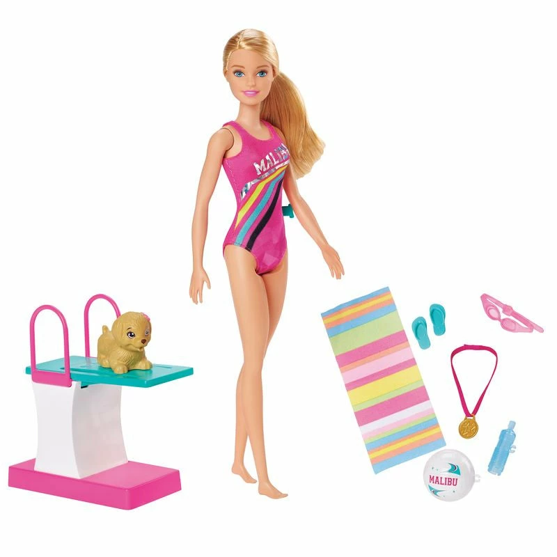 Spark storytelling and sports-play with Barbie dolls inspired by Barbie Dreamhouse Adventures! Young imaginations can dive into fun with this Barbie Swim ‘n Dive doll wearing colourful swimwear with sporty stripes and shimmery accents. When she’s ready to hit the water, press the lever on her waist to see her legs move and play out “swimming” action. Place Barbie doll’s puppy friend on the diving board to see her flip or fill her with water and squeeze — she doubles as a squirt toy! There are so many storytelling opportunities: dress Barbie doll in goggles and practice perfect form on the diving board or run plays with a water polo ball. When she’s done splashing around, Barbie® Swim ‘n Dive doll can wear her gold medal accessory and chill out with a water bottle, sandals and towel. With dolls inspired by Barbie Dreamhouse Adventures, imaginations can peek into the everyday life of Barbie as she embarks on exciting adventures with her family and friends. Aspiring athletes will love taking her on active adventures and exploring sports stories because when a girl plays with Barbie®, she imagines everything she can become! Collect all the Barbie Dreamhouse Adventures dolls and toys to recreate favorite moments or dream up adventures of your own. Each sold separately, subject to availability. Doll cannot stand alone. Colors and decorations may vary. Features: Dive into storytelling with Barbie Swim ‘n Dive doll, inspired by Barbie Dreamhouse Adventures, in swimwear with sporty stripes and shimmery accents. When she’s ready to hit the water, press the lever on her waist to see her legs move and play out “swimming” action! Barbie doll’s puppy friend can do a flip when she’s placed on the diving board or double as a squirt toy when she’s filled with water. Swim-themed accessories include a water polo ball, goggles, a gold medal, sandals, towel and water bottle. When a girl plays out sports stories with Barbie, she imagines everything she can become! Collect all the Barbie Dreamhouse Adventures dolls and toys to recreate favourite moments or dream up adventures of your own. Each sold separately, subject to availability. Barbie Dreamhouse Adventures Swim ‘n Dive Doll, 11.5-inch in Swimwear, with Diving Board and Puppy Includes 1 Barbie® doll, 1 puppy figure, 1 diving board, 1 ball, 1 pair of goggles, 1 gold medal accessory, 1 pair of sandals, 1 towel, 1 water bottle. 3+