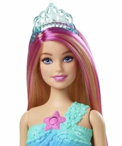 BarbieĀ® doll’s fantasy look is complete with rainbow fins, a ‘pearl’-detailed bodice, pink-streaked hair and a princess tiara.