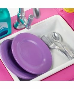 The dishwasher features a sink, working door and pull-out tray, plus kitchenware to load and unload.