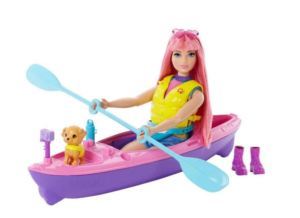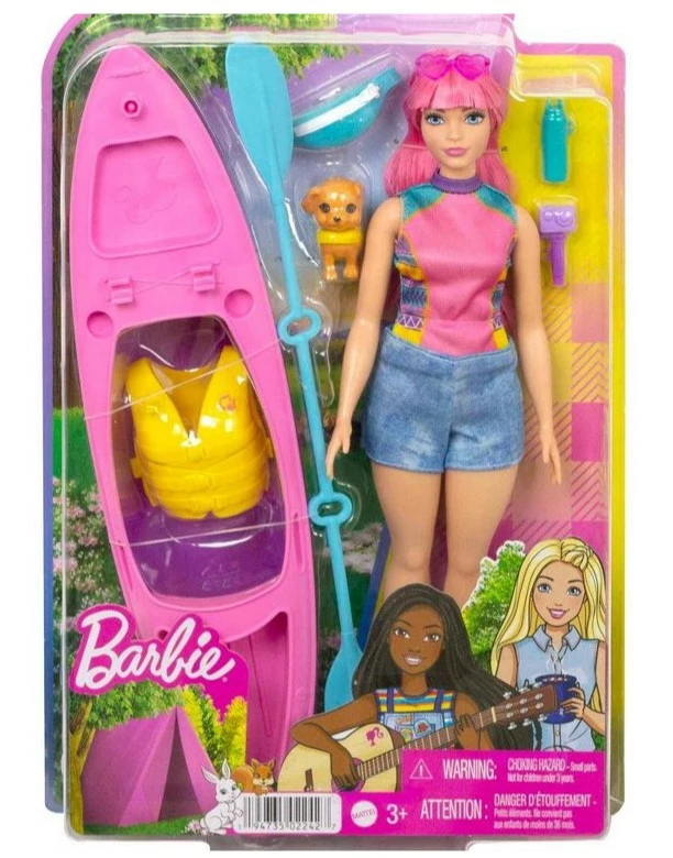 Head to the great outdoors and play out camping fun with Daisy doll inspired by the hit Barbie series, It Takes Two! Dress Daisy doll and her pet puppy in their life vests and seat them in the kayak -there’s a special seat for puppy! Handles on the paddle make it easy for Daisy doll to grasp, an activity camera mounts to the front of the kayak to document her trip, and a water bottle is included to keep her hydrated all day long. Daisy doll is ready for all-day play in a cool camping outfit, and a waist bag and stylish sunglasses complete her adventure-ready look. With so many storytelling opportunities, this Barbie It Takes Two doll and playset inspires kids ages 3 to 7 years old to dream up endless outdoor adventures! Doll cannot stand alone. Colors and decorations may vary.