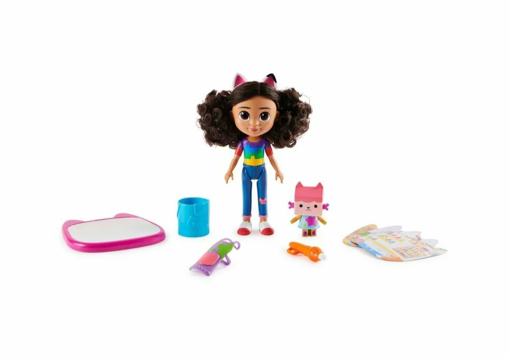 Includes: 1 Gabby Doll, 1 Baby Box Cat figure, 1 water brush, 1 pad with water reveal label, 1 apron, 1 paint bucket, 3 activity sheets