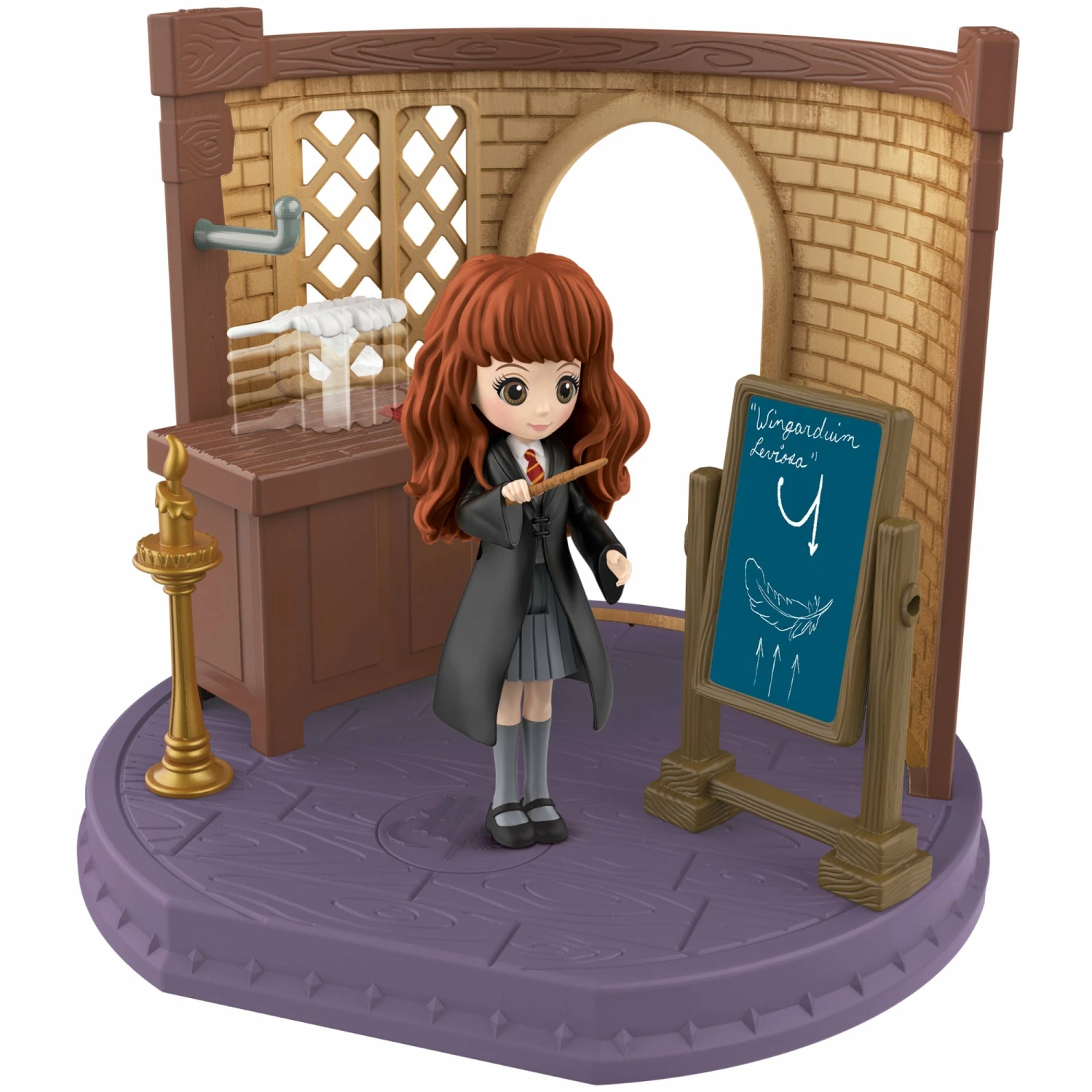 Join Hermione while pretending to practice and perfect spells in the Wizarding World Magical Minis Charms Classroom! Featuring an exclusive 3-inch Hermione Granger doll and three themed accessories, young witches, wizards, and Muggles can recreate their favorite Harry Potter scenes with this fun playset. Pose Hermione and move her arm to use her wand, then make the feather float by moving Hermione over the activation spot. Wingardium Leviosa! The feather lifts off the desk and magically levitates! Add to your storytelling with the chalk board, spell book and candle stick accessories. The Charms Classroom even has a perch for Hedwig (not included) to observe your spellbinding adventures. The Magical Minis Charms Classroom is the perfect way to inspire your imagination through fun and exciting pretend play. Connect the playset into the Magical Minis Hogwarts Castle (sold separately) and expand your Magical Minis small dolls world with the Potions Classroom and Care of Magical Creatures Playset (doll playsets each sold separately). Collect and connect all of the Magical Minis dolls, Friendship Sets and playsets to build out your own Wizarding World (each sold separately)! Magical Minis Harry Potter toys are the perfect gifts for kids and Harry Potter fans. Experience the magic of Harry Potter with the Wizarding World Magical Minis Charms Classroom!
