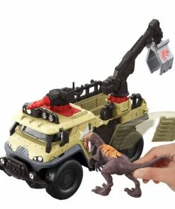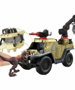 This off-road style vehicle with rolling wheels is geared up to capture dinosaurs on the loose! Loaded with fun, the vehicle has blaster and tranquilizer dart, swiveling crane for dinosaur lifting and flat bed for transport. Stretchy chains across the back secure the captured animal. But the Dinosaurs can fight back and destroy parts of the vehicle, with a breakaway side and front cabin! Pack comes with a velociraptor figure for play right out of the box.