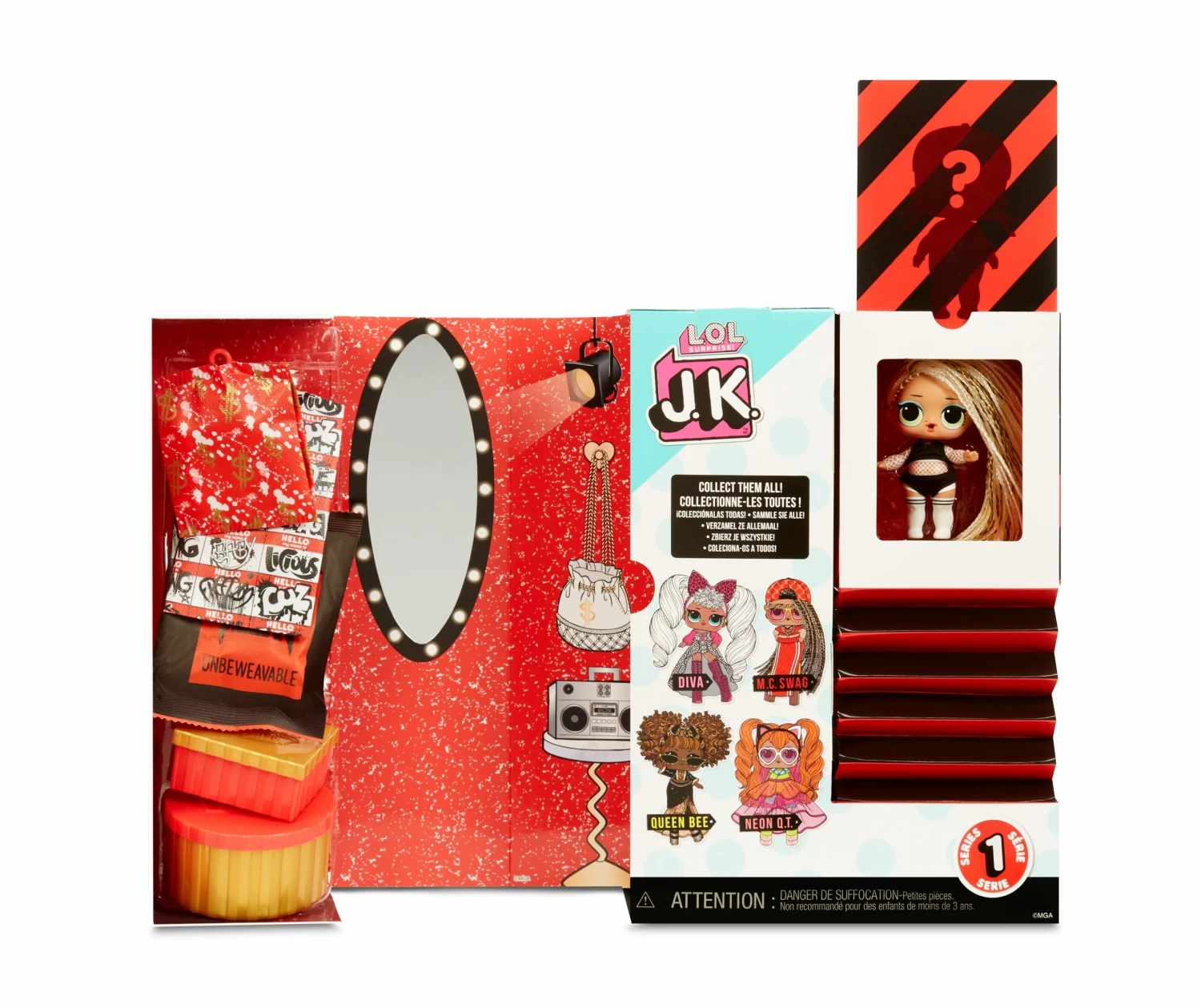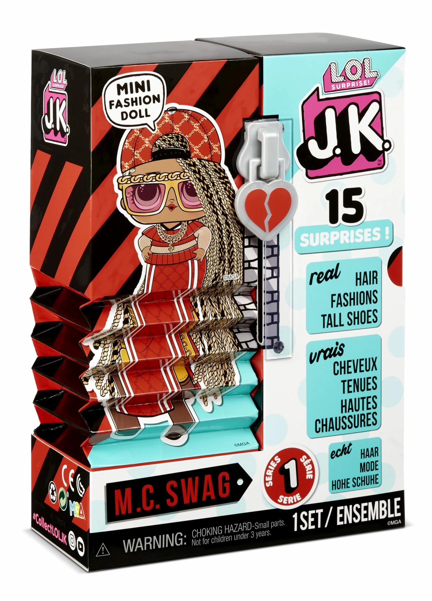Unbox 15 surprises including a mini fashion doll with LOL Surprise JK. Fan favorite character M.C. Swag is back, but she got a fierce, runway-ready makeover.
