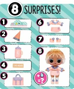 8 surprises: (1) Secret Message; (2) Party Hat; Bottle; (4-5) Accessories; (6) Fashion; (7) Shoes; (8) L.O.L. Surprise! Present Surprise Series 2 doll. Collect all 12.
