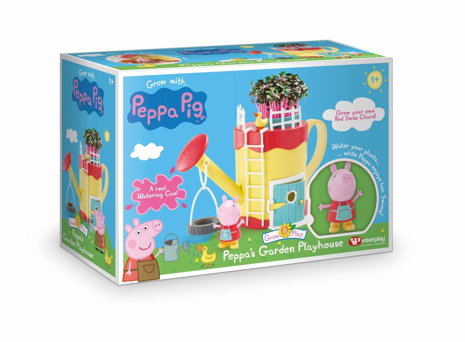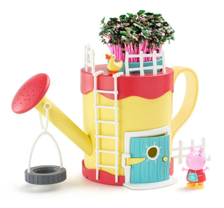 Contents include A Peppa Pig Figure A Mrs. Duck Figure A Watering Can / playhouse One coloured planter. A pack of easy-grow seeds. 3+