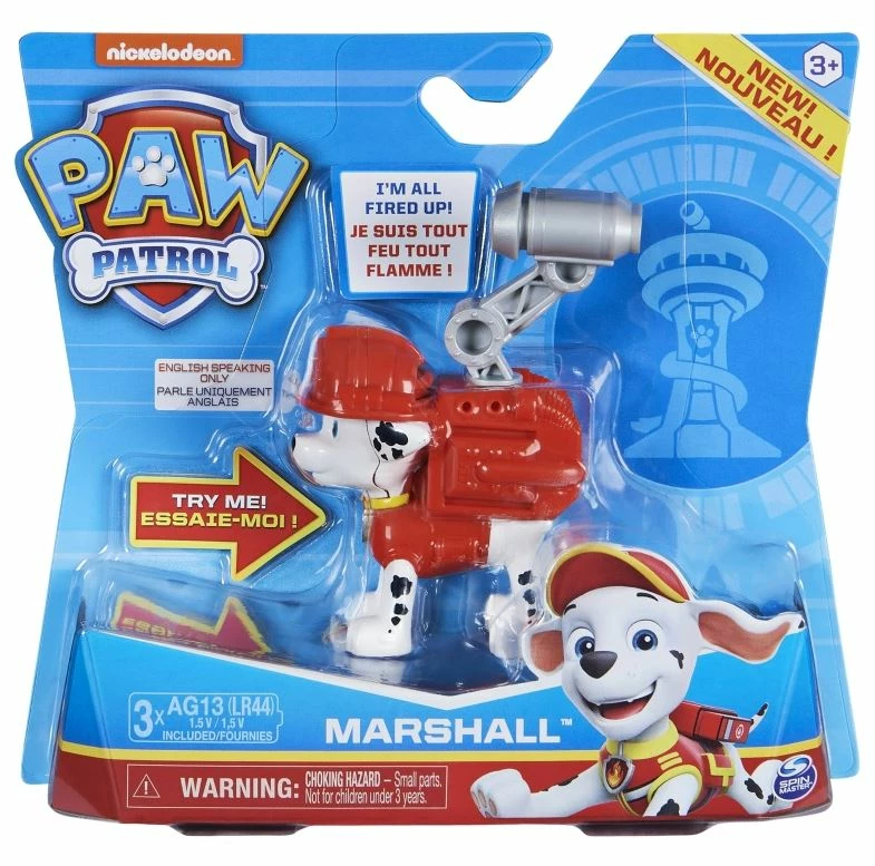 PAW Patrol’s Marshall is all fired up! Wearing his classic rescue uniform, this collectible figure of PAW Patrol’s heroic pup makes sounds and says catchphrases, bringing the excitement of the hit show to life! As you use your imagination to play out your own rescue adventures, push the badge button to activate the sounds and phrases. Then, rotate the tool on your figure’s backpack to help with your rescues! Push the badge button again for even more sounds and phrases!