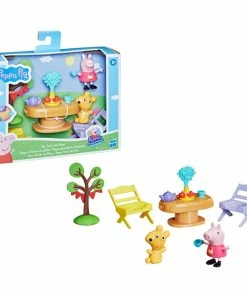 Accessories include Peppa’s teddy bear (the guest of honor), a tree decorated with garland, 2 chairs, and a special table featuring a dial in the center. When kids spin the dial, a tray pops out from the middle, displaying sandwiches and cupcakes! Preschoolers and Peppa fans ages 3 and up will love to act out all kinds of tea-party fun with this sweet themed set.