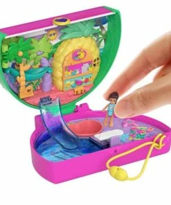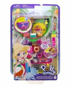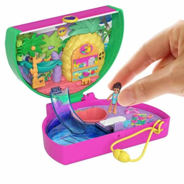 The Polly Pocket™ Watermelon Pool Party Compact™ is shaped like a watermelon slice with a ‘scented’ feature on the exterior. Compact opens to tropical pool party with a pool that can be filled with water and comes with micro Lila™ and mermaid dolls.