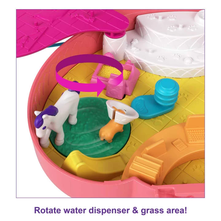 Open the compact to reveal an exciting pet vet-themed adventure featuring Shani and friend micro dolls and 18 accessories like a pony, cat, dog, turtle, and other animal figures plus pet vet accessories (some have a Pop & Swap peg feature). Discover and play out the storytelling fun by sliding out the floor wings, opening the fence and dog house doors, folding down the left wing stairs, sliding the X-ray up and down and rotate the water dispenser and grass area.