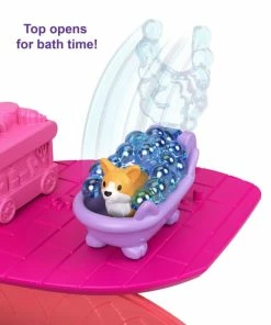 Play out pet vet-inspired adventures with these accessories: open the pet carrier and place a pet inside, open the bubble bath to wash a pet, put a cone on a pet, and clip the bird accessory on the tree.