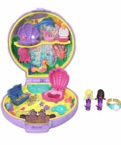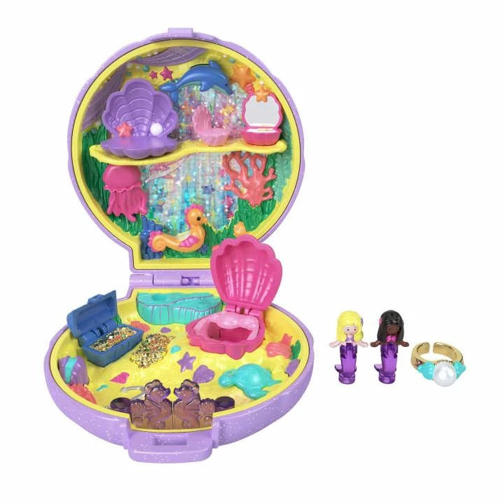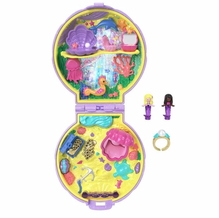 Open the compact to discover a colorful undersea world with a brilliantly colored holographic background that really shimmers, 2 mermaid dolls, an enchanting treasure chest featuring a beautiful golden finish, and a clam that opens to reveal the perfect ‘pearl’ ring to wear and collect. The compact comes in a special collectible box with the unique Keepsake Collection designation, perfect for display! Colors and decorations may vary. Makes a great collectible gift for the holidays, special occasions, collecting and will appeal to Polly Pocket™ fans of all ages. For ages 4 years old and up.