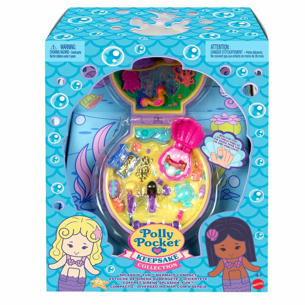 For more than 30 years, Polly Pocket™ has been enchanting fans everywhere with tiny worlds and big surprises. The Polly Pocket™ Keepsake Collection brings back the magic of classic fan favorites from the heritage Polly Pocket™ vault some are never-before-seen compacts and others are updated recreations. This Polly Pocket™ Keepsake Collection Mermaid Dreams™ compact is from the collection vault and has never been seen before until now!