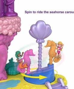 Get ready for Theme Park Adventures with Polly Pocket! The Rainbow Funland Mermaid Cove Ride playset features an enchanting underwater theme and has a turret that spins and dispenses 15 accessories (kids can reload and play again and again). Ride the seahorse carousel, play in the turret with multiple rooms (a game room, ice cream booth and seashell throne room). Also go on the swing and slide down the slide!