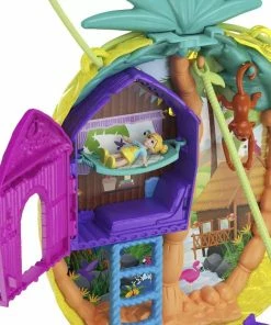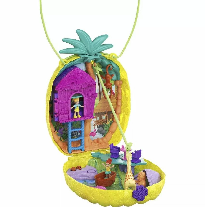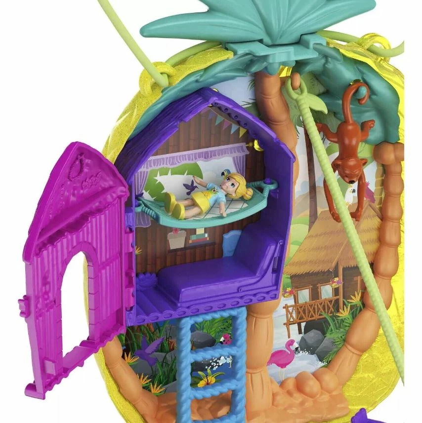 Features: This adorable Tropicool Pineapple purse compact opens to an exciting safari adventure with micro Polly and Lila dolls, a monkey figure and boat that fits 2 dolls. Discover and explore these fun activities and reveals: the treehouse opens to find a swinging hammock; zipline for fast fun; hang out with the monkey; find hidden animals like a lion in a cave and pop-up meerkats and hippo; eat yummy food at the rainforest caf‚ and more!