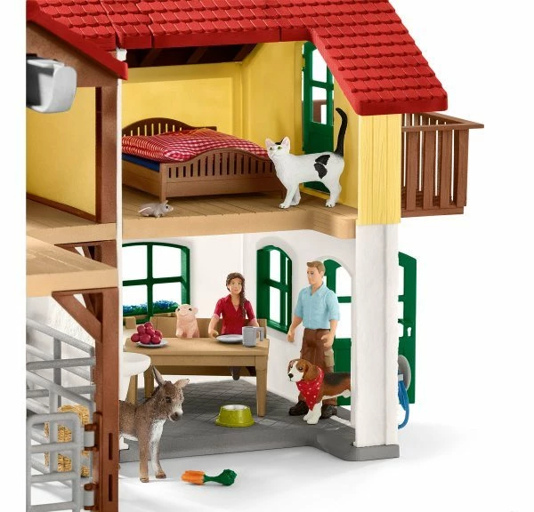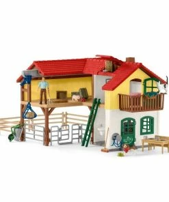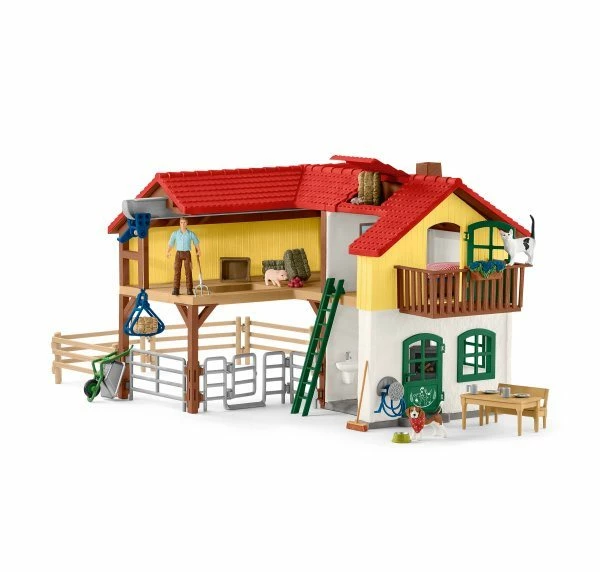 The large farm from Schleich© is the centrepiece of the Schleich FARM WORLD. Farmers Paul and Laura live here. Both of them lovingly care for the animals on the farm. The set includes a whole host of accessories and functions for hours of fun. Next to the living area with kitchen, dining area and bedroom, there is the stable, which provides plenty of space for the animals. The hay can easily be transported to the loft for storage with the winch. The hay can then be moved from there through the hatch to the animals. The stable area with fences and paddocks has a modular design and can be assembled as you wish. The set is compatible with the 42377 hay conveyor and 42379 tractor, which are available separately. With 2 human figurines, 7 animals and great accessories. The Schleich© figurines are exceptionally detailed, lovingly painted and allow children to play and learn at the same time.