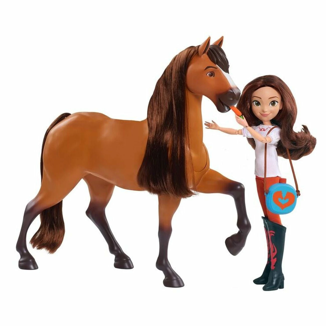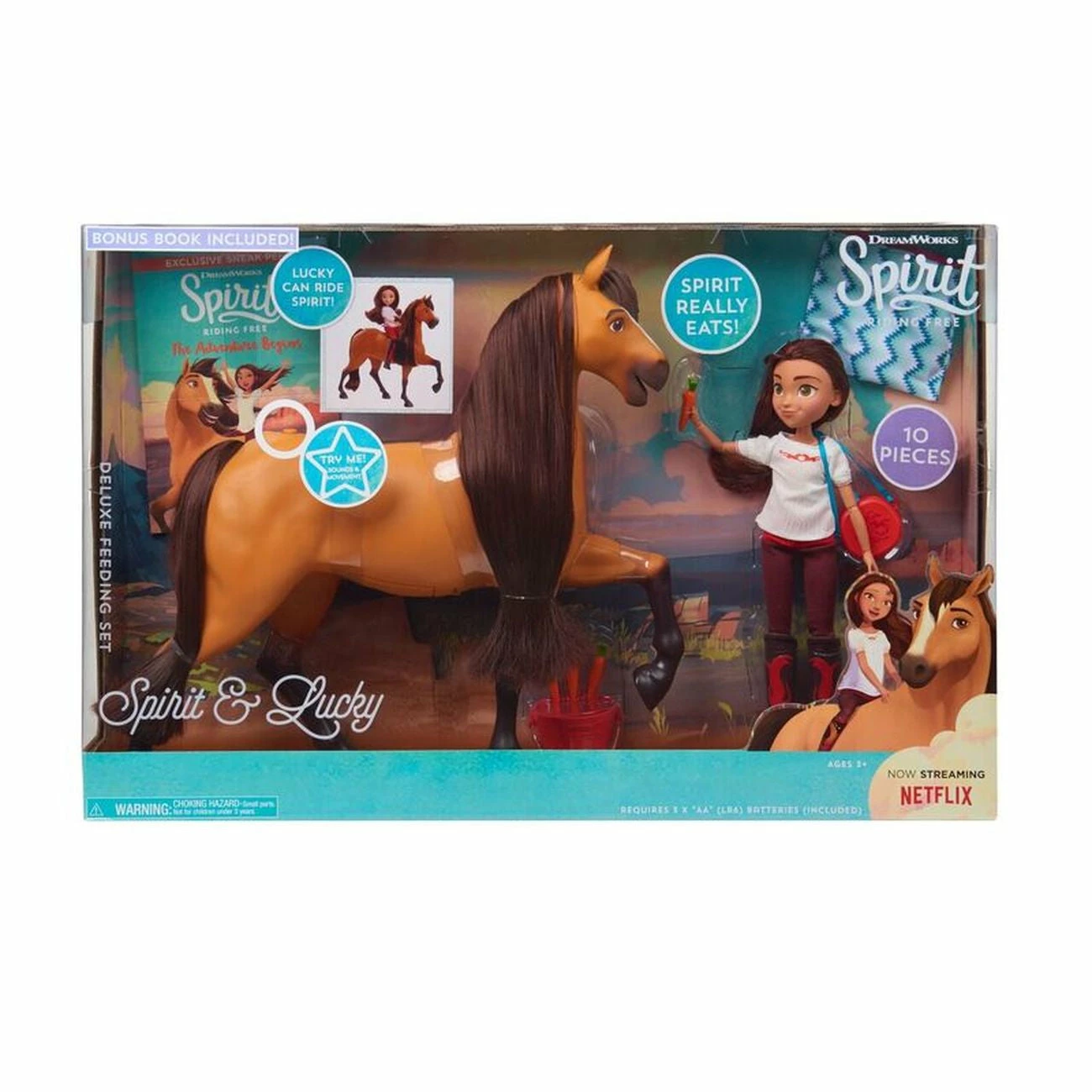 “The Spirit & Lucky Deluxe Feeding Set, inspired by DreamWorks Animation Television’s new series, Spirit Riding Free, is the ultimate horse and doll play experience!? This dynamic set comes with a 30cm Lucky doll featuring poseable arms and legs and a 36cm Spirit horse featuring life-like movement and realistic horse sounds!? Lucky can feed Spirit carrots and Spirit will really eat them! Just press the button on the back of Spirit to activate realistic mouth and jaw movement.? Spirit can dip his head down when it’s time to eat or drink just like a real horse!? Lucky comes dressed in her signature outfit and special boots from the show. L ucky can ride Spirit and also features poseable arms and legs so kids can move her into fun action poses!? Full set includes: one feature Spirit horse, one poseable Lucky doll, one canteen, one bucket, four play carrots, one blanket, and a chapter book titled, DreamWorks Spirit Riding Free: The Adventure Begins written by Suzanne Selfors.? Ages 3+