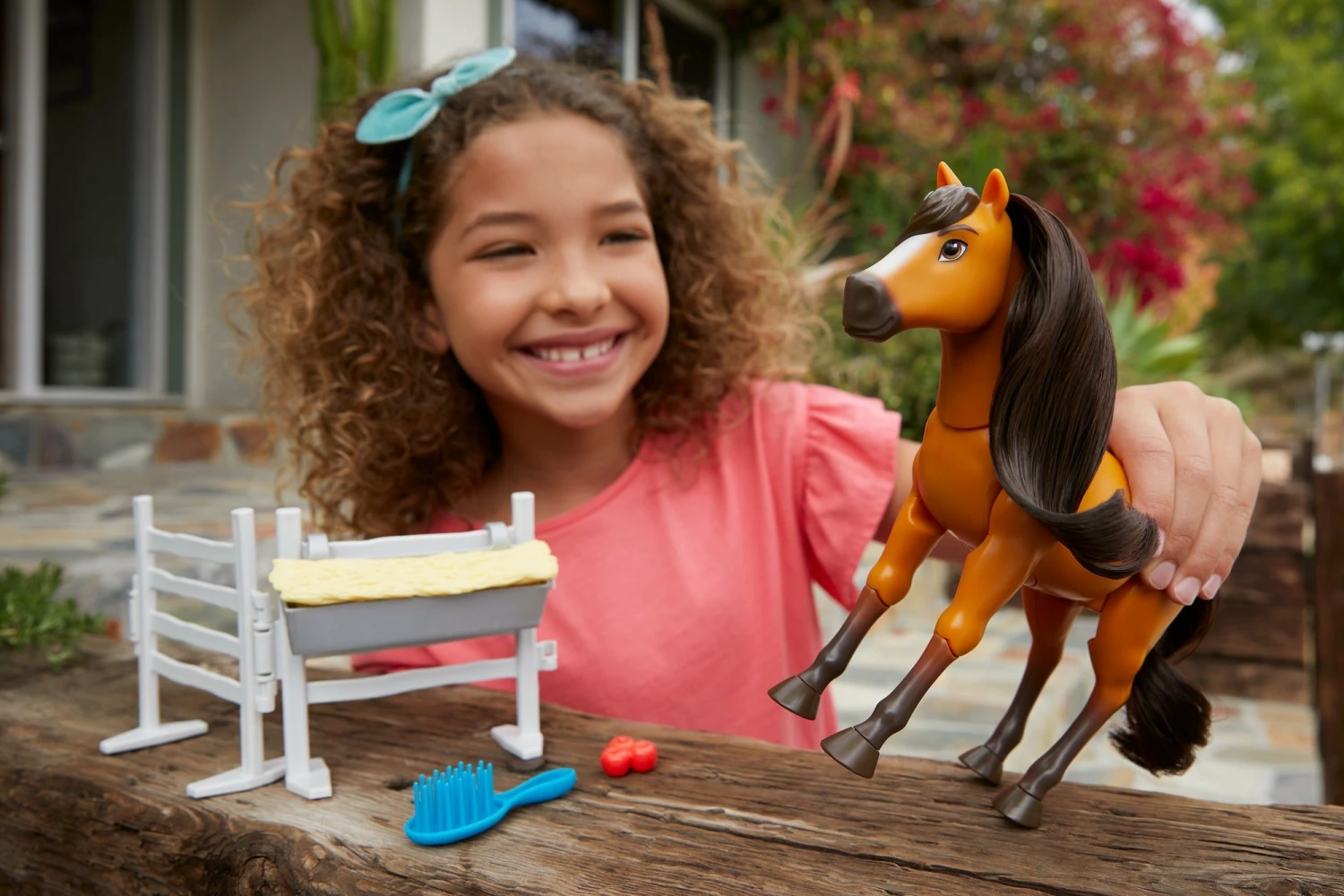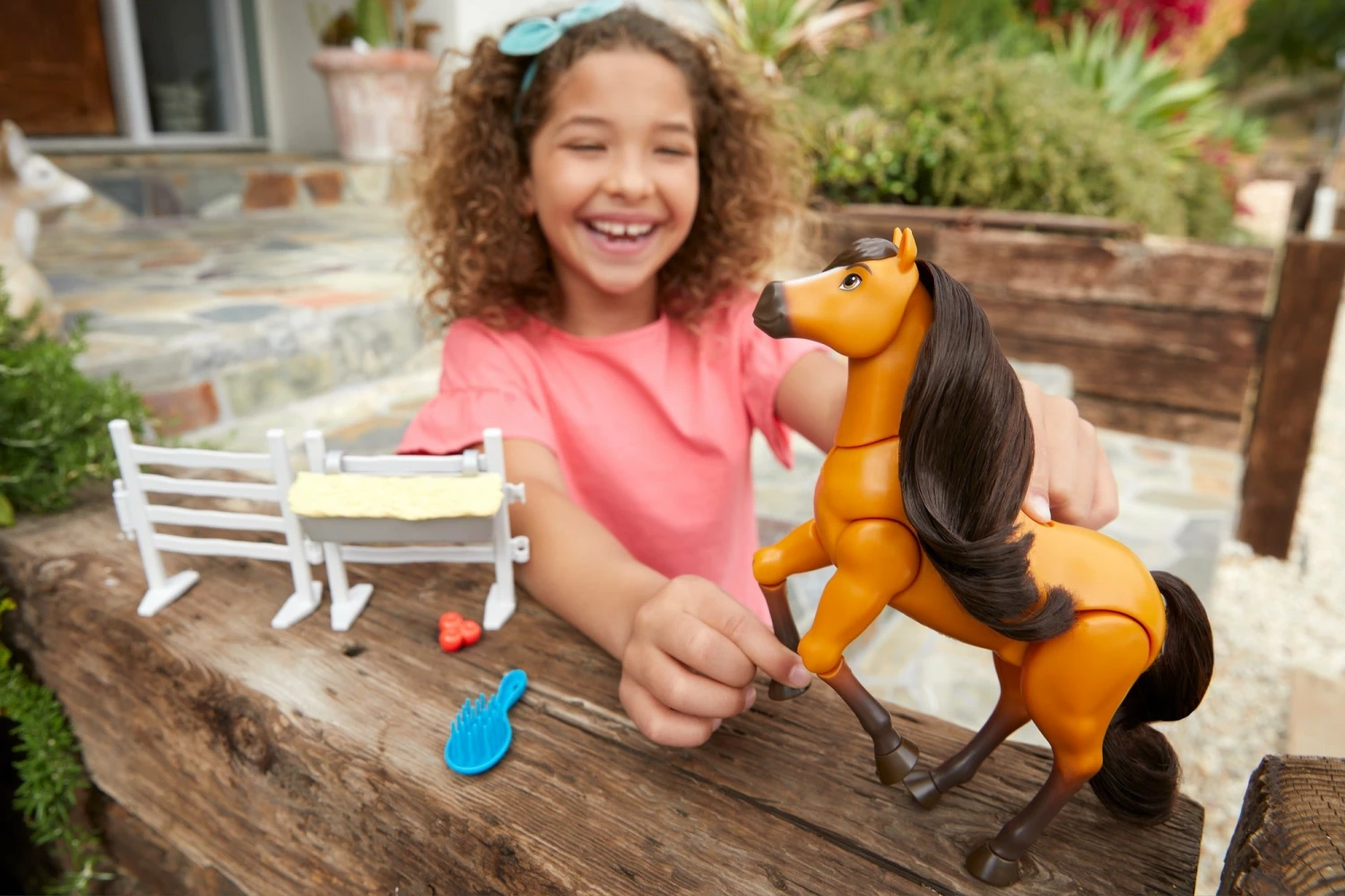 Be a part of the friendship, bravery and adventure with DreamWorks animated film, Spirit Untamed! Capturing all the action and excitement of the movie, the Forever Free Spirit horse (approx. 8-in/20.32-cm) has a realistic walking feature (place horse on surface and activate button), neighing sounds and a long beautiful mane and tail. Spirit also comes with a fence and a bale of hay for jumping action plus a brush for hair play fun and apples for snack time! From action play to hair play, kids will love all the versatility with this beautiful horse inspired by the movie! Colors and decorations may vary. Makes a great gift for ages 3 years old and up.