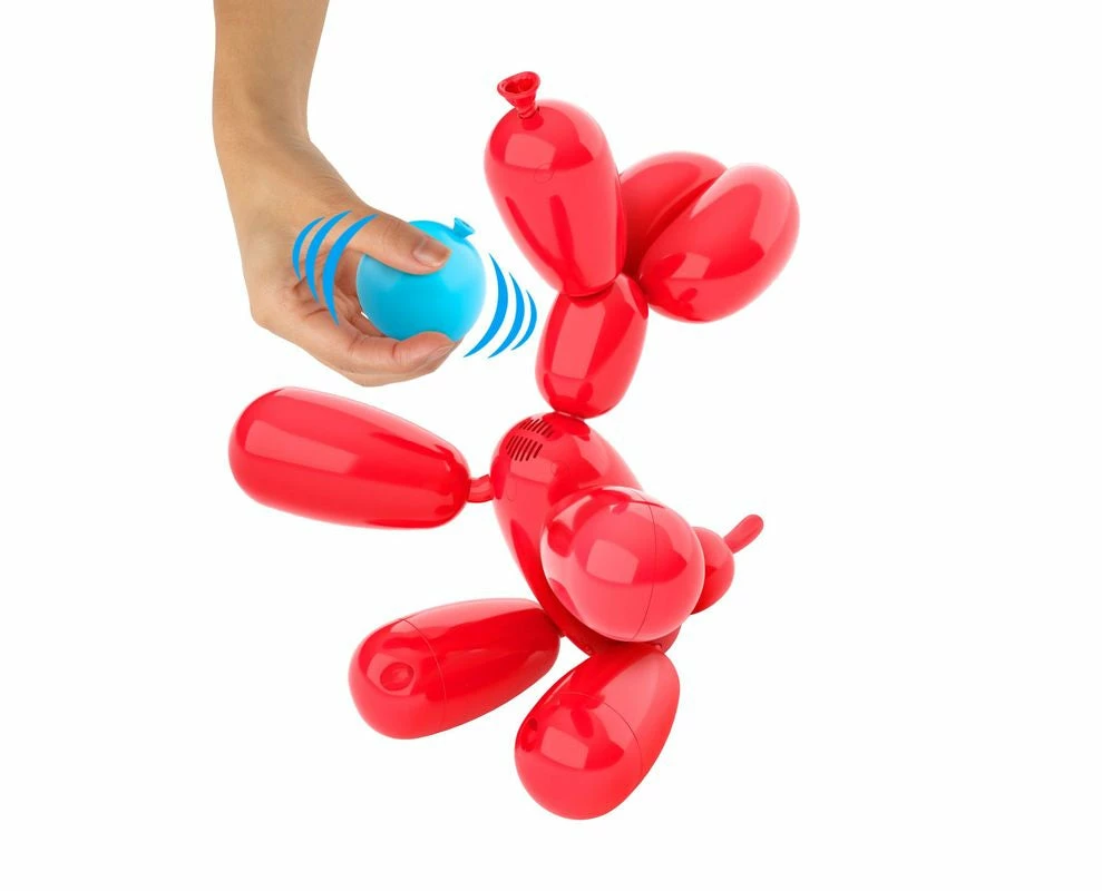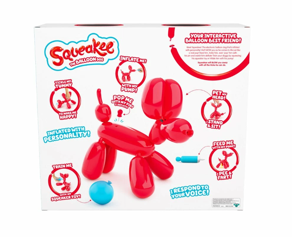 Meet Squeakee! The first ever balloon pet that is inflated with personality! He’ll WOW you as he comes to life just like a real pup! Squeakee is so interactive and loves to play with you! This very playful toy responds to your voice, is full of sound and movement and looks just like a real Balloon Dog! Watch him sit and stand as you pet his head or tickle his tummy to make him happy! Squeakee comes with a range of fun accessories for you to interact and play with. Use his Pump to feed him. Place the Pump in his nose and hear him inflate! But be careful, when he’s full he may pee or fart! Squeakee loves his Squeaker Toy and gets very excited when he hears it! Use his Squeaker Toy to train him to sit or beg! Feed him, teach him, even POP him with his Pin and watch him deflate! You’ll be blown away at all his reactions and what he can do!