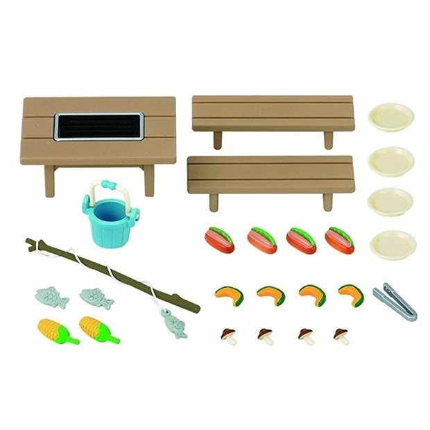 The Family Barbecue Set includes a nice barbecue stove in the centre of the table so you can grill vegetable and fish. It also includes dishes, vegetables, hot dogs, fishing rods, and buckets for 4 people.