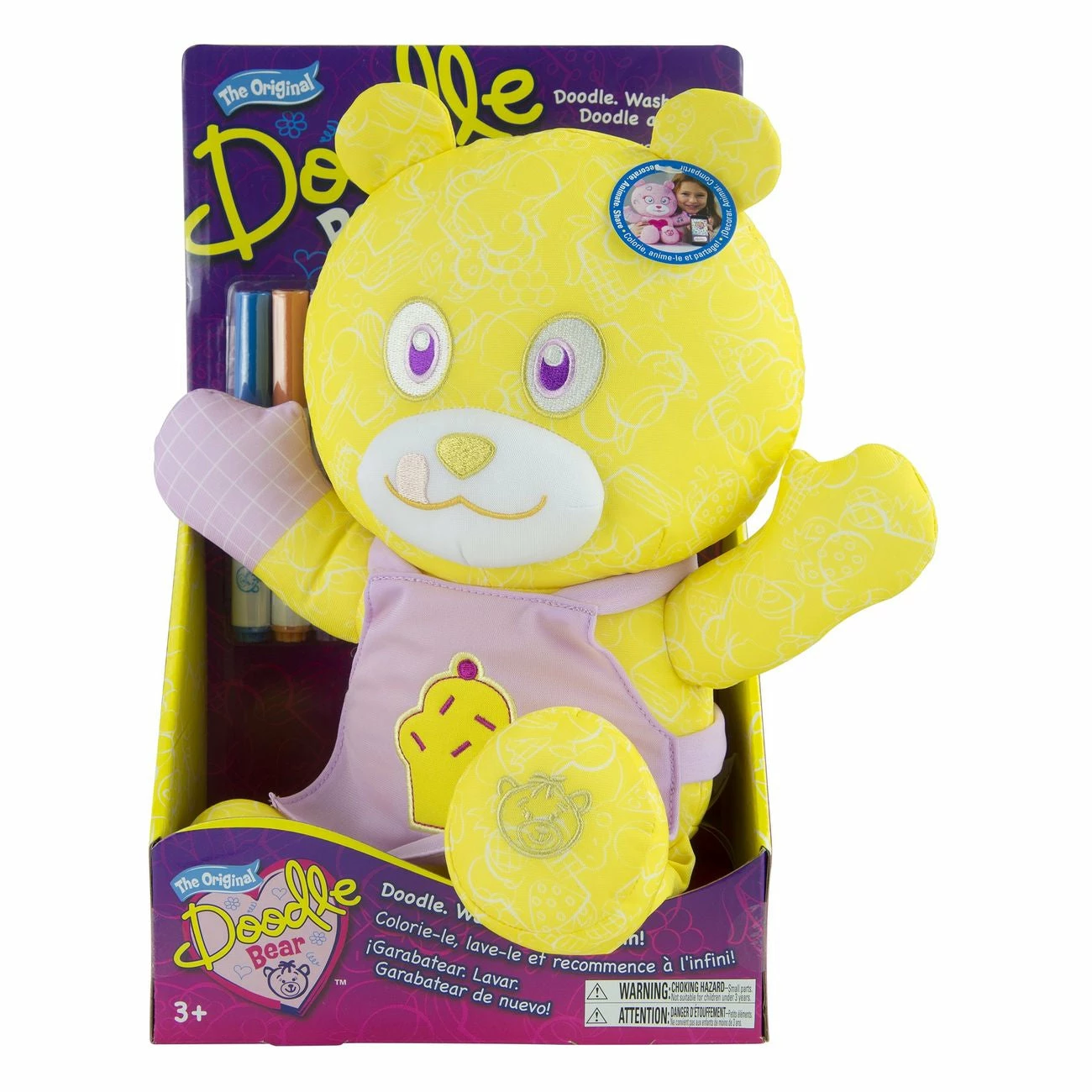 The Original Doodle Bearâ„¢ is back and better than ever! These adorable bears still love to be decorated..and cuddled too! Each bear toy includes three Doodle Markers that let kids set their inner artist free as they create oodles of doodles on their bear. But now there’s even more to do! Download the free Doodle Bear Studio App and take a picture to bring your bear to life! Customize the background with cute preloaded stickers, or use the pencil tool to create your own fun drawings. You can even record a message. Try your normal voice, or choose an effect to make yourself sound funny! When ready, save the finished project and share your favorite Doodles with friends. Done for the day? Just like the original Doodle Bear, parents can safely wash Doodle Bear so that the fun can start all over again. Doodle. Wash. Doodle again! What will you Doodle today? DECORATE, ANIMATE, SHARE! The Original Doodle Bear is back and better than ever with even more to do!