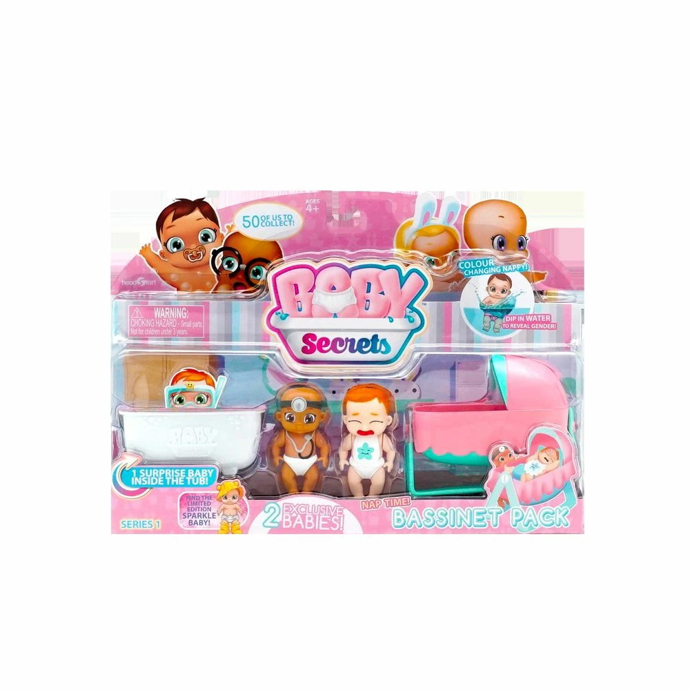 These cute babies have a secret for you to discover! Dip their nappy/diaper in the water filled bath tub and it will change colour to pink or blue to reveal their gender. Once the secret is out you can name your baby on the birth certificate! Theme Pack comes with an assortment of accessories! Take your baby for a walk in your Pram, feed them in the High Chair, play in the Rocking Horse or go to sleep in the Bassinet!