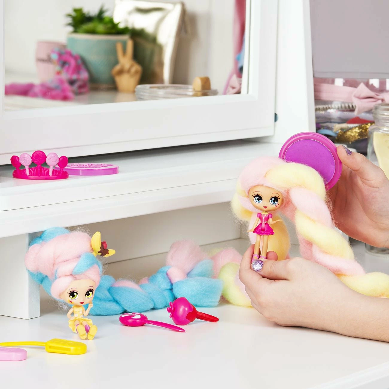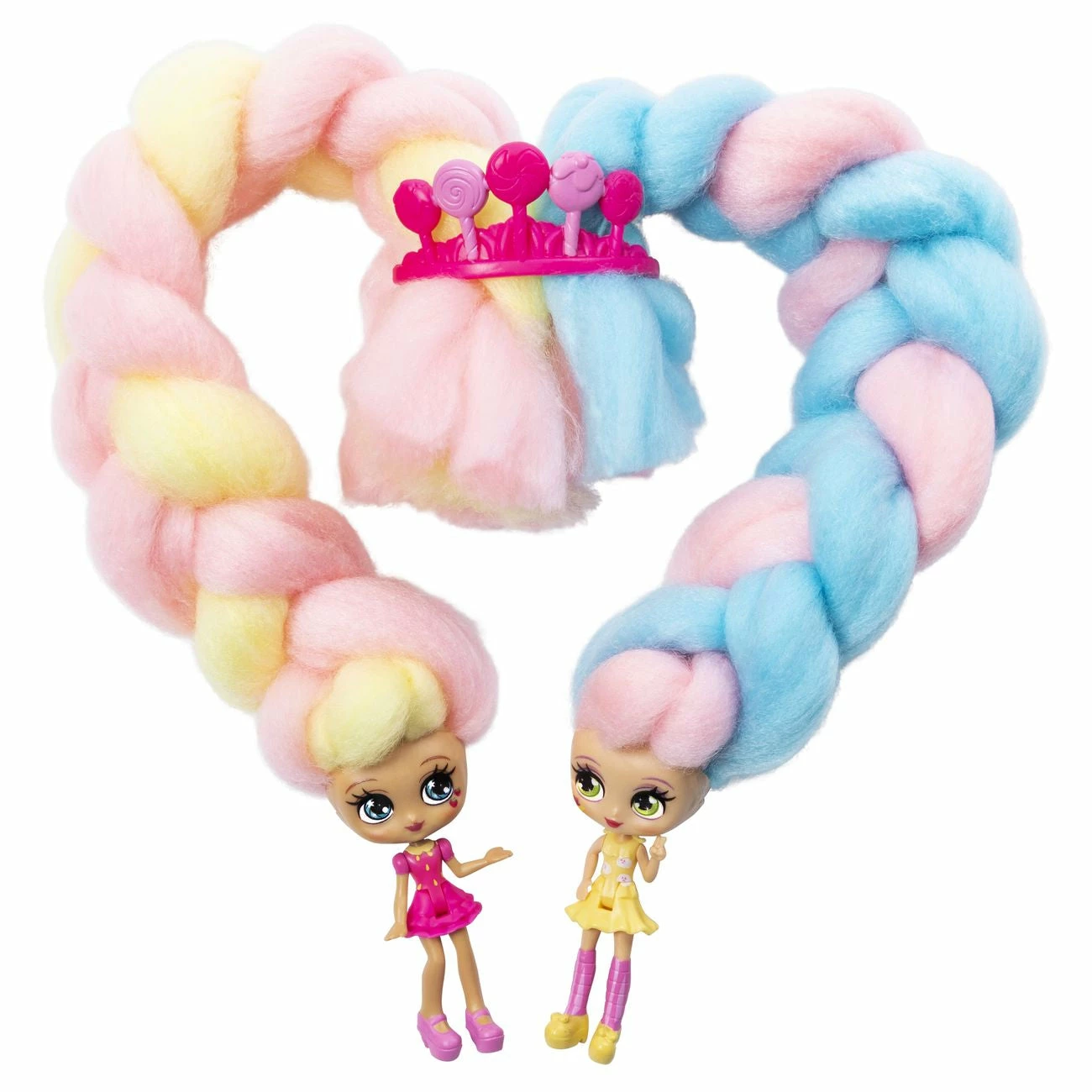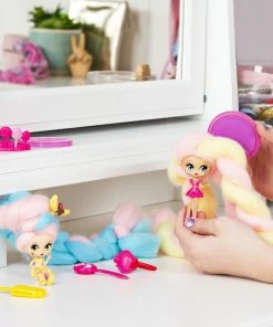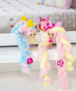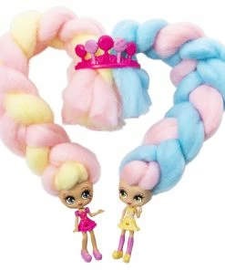 Who’s in there with the cotton candy hair? It’s Candylocks, scented collectible dolls with hair so soft, it looks just like cotton candy! This Sweet Treats BFF set includes two matching strawberry banana themed Candylocks dolls, Kerry Berry and Beau Nana! With 15 inches of colorful cotton candy-inspired hair wrapped around each doll, the Candylocks BFF’s are hidden inside the pack! Open up the packaging and unravel each doll’s hair to reveal the pair of Candylocks cuties and their hair accessories. These super sweet BFF’s have detailed outfits matching their theme, and smell like strawberry and berry! The unique texture of Candylocks’ extra-long hair makes it easy for kids to work with, without hair styling tools, it holds its shape and doesn’t come apart. Create handmade braids and buns, twists and ponytails – the hairstyle possibilities are endless! With seven accessories included for your besties to wear and share, you can customize their looks! Open up the package to find BFF pull-apart hair pin accessories, hair chalk to add color, a lollipop crown you can also wear as a bracelet, and more! There are four pairs of Candylocks BFF’s, for a total of eight dolls to add to your collection. Bring home two of a kind sweet treats with the Candylocks Sweet Treats BFF 2-Packs!