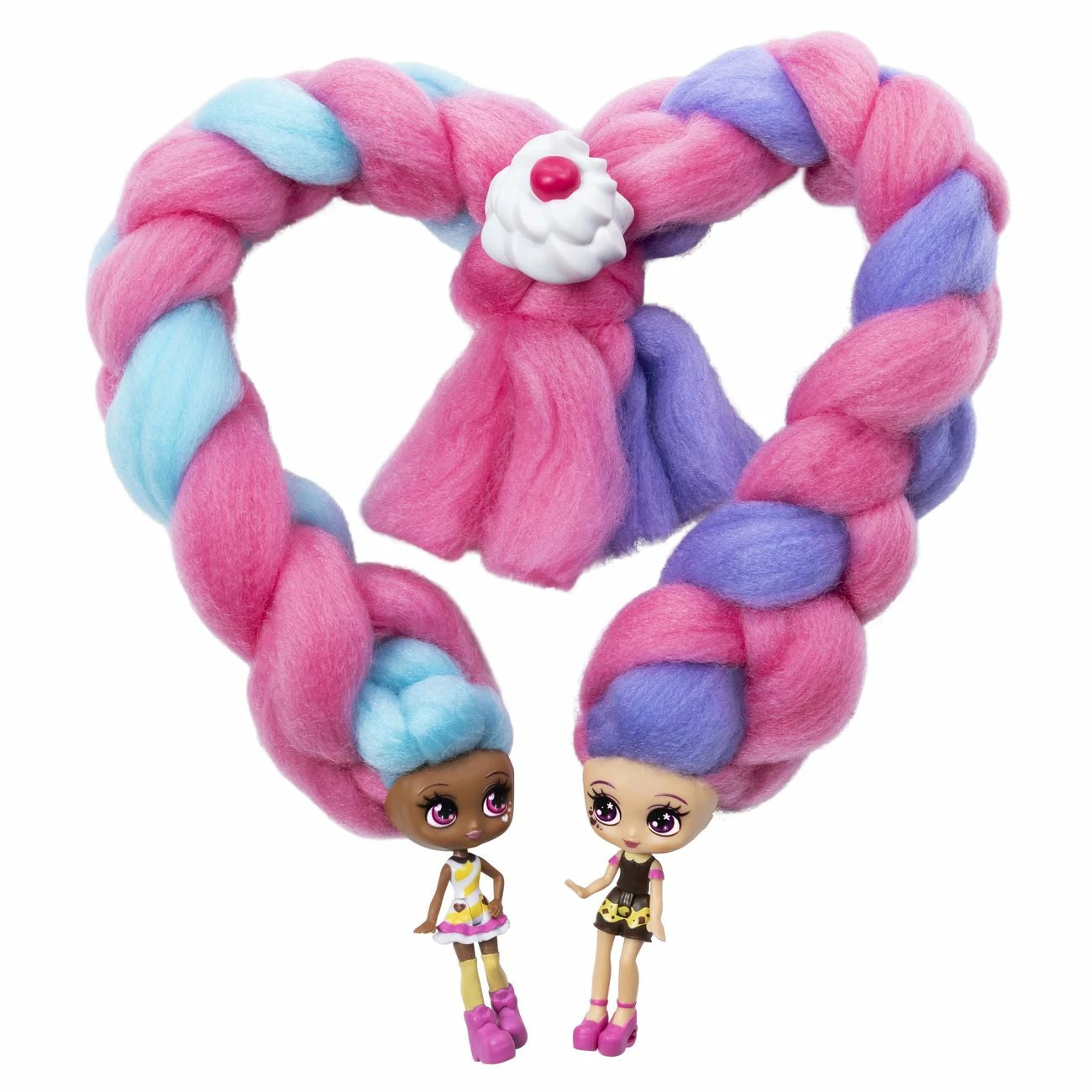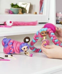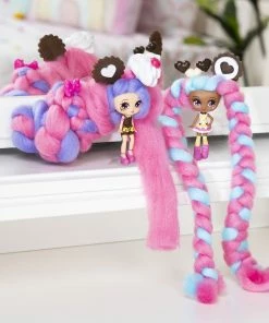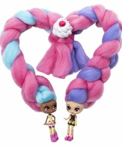 Who’s in there with the cotton candy hair? It’s candylocks, scented collectible dolls with hair so soft, it looks just like cotton candy! This Sweet Treats BFF set includes two matching cookies and cream themed Candylocks dolls, Cora Cr?me and Charli Chip! With 15 inches of colorful cotton candy-inspired hair wrapped around each doll, the Candylocks BFF’s are hidden inside the pack! Open up the packaging and unravel each doll’s hair to reveal the pair of Candylocks cuties and their hair accessories. These super sweet BFF’s have detailed outfits matching their theme, and smell like vanilla and chocolate! The unique texture of Candylocks’ extra-long hair makes it easy for kids to work with, without hair styling tools, it holds its shape and doesn’t come apart. Create handmade braids and buns, twists and ponytails – the hairstyle possibilities are endless! With seven accessories included for your besties to wear and share, you can customize their looks! Open up the package to find BFF pull-apart hair pin accessories, a hair cone, hair chalk to add color, a hair extension for you or your doll to wear, and more! There are four pairs of Candylocks BFF’s, for a total of eight dolls to add to your collection. Bring home two of a kind sweet treats with the Candylocks Sweet Treats BFF 2-Packs!