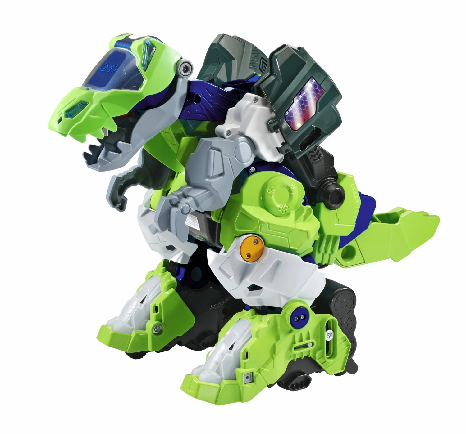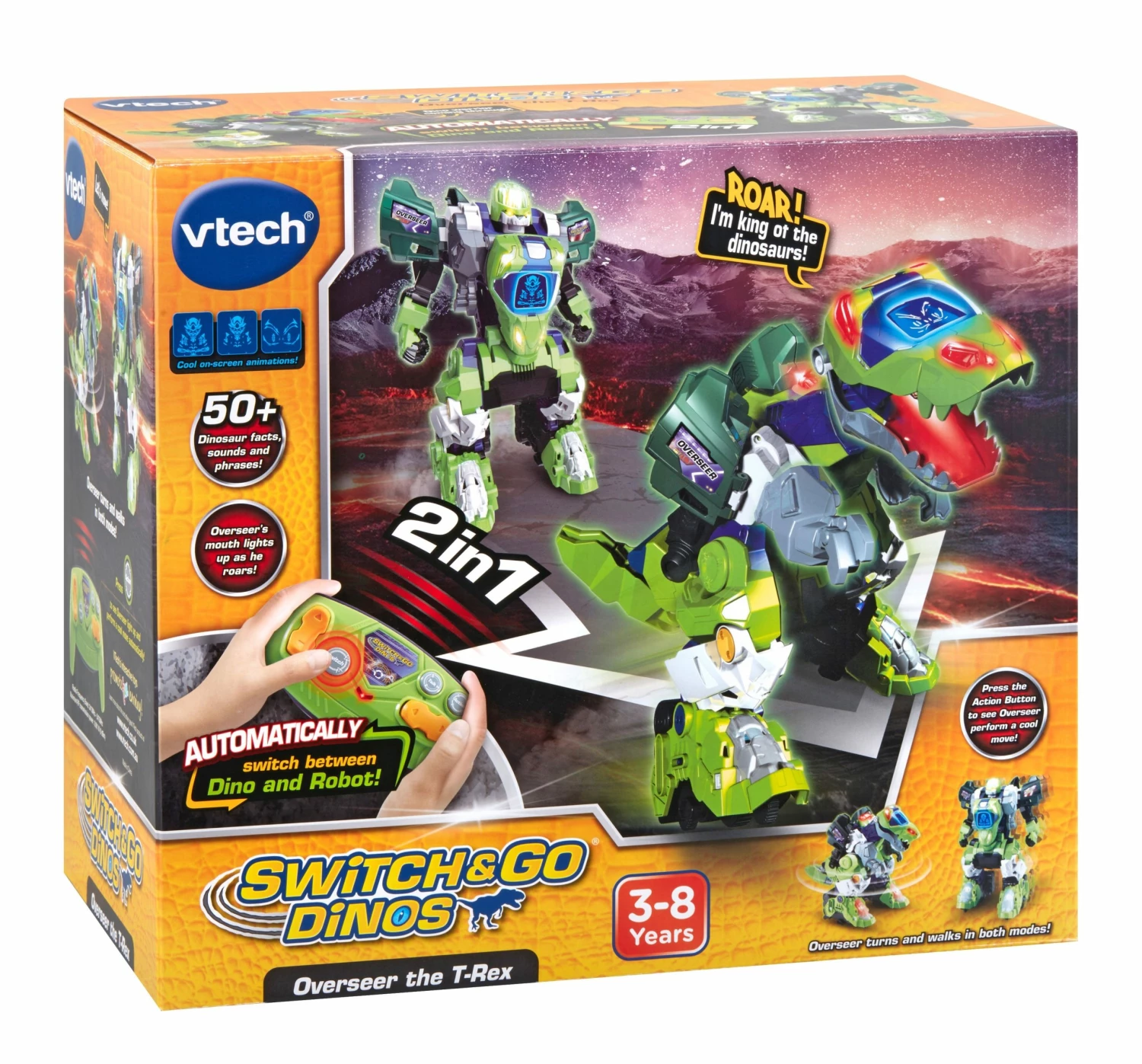 Introducing Overseer the T-Rex by VTech! This wild Switch & Go Dino is an exciting 2-in-1 toy which automatically switches between a fierce T-Rex and a mighty Robot! The backlit screen on Overseer displays animated dino eyes and robot controllers! Use the remote control to move Overseer and see them stomp their legs! Pressing the Talk Button triggers fun phrases and cool dinosaur facts! Overseer also responds with lively dinosaur and robot sounds! They even light up with the responses! The Stunt Button makes Overseer perform cool actions! Hear even more great sounds when Overseer moves and switches between dinosaur and robot! 3+